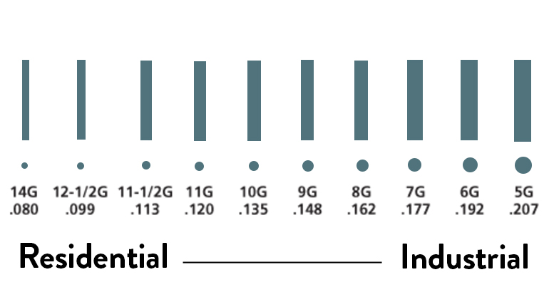 The gauge can vary by end-use, but the most common gauges are 6, 9 and 11-1/2. Thicker gauges = commercial/industrial use.